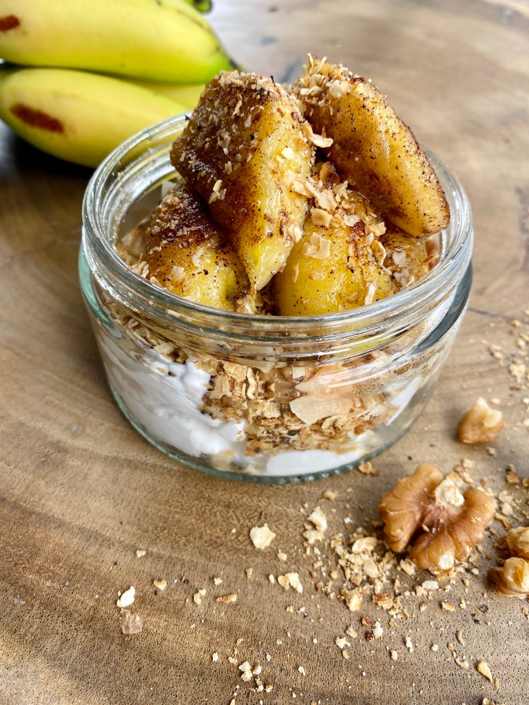 I wanted to make a dessert that is easy and quick to make without baking, light, and also good for breakfast. I chose banana as one of the main ingredients because it’s perfect for breakfast and desserts with its sweet and delicate taste. There are many ways how to use bananas, I think they are the most used ingredient in healthy desserts and baking. The baked and caramelized banana tastes different from a fresh one, it’s creamy and sweet and gives new variations on how to use bananas.