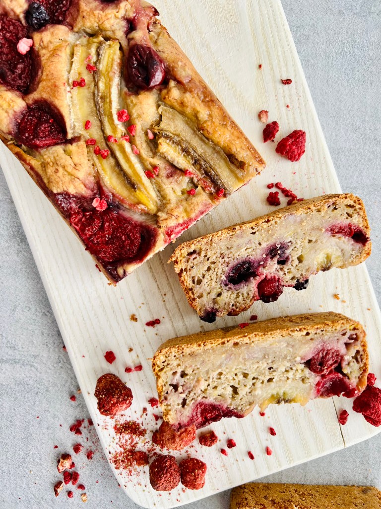 - Pour over the rest berries. Cut the remaining banana lengthways into slices and top with them the banana bread by pressing into the batter.