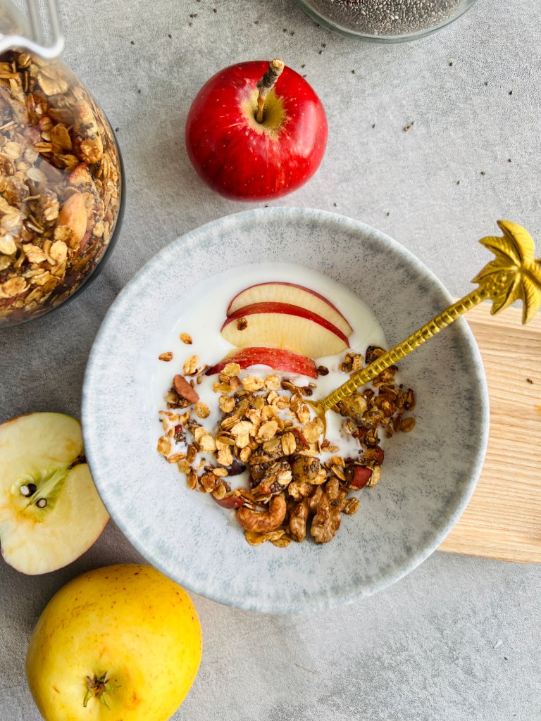 This is the best fall granola loaded with sweet apple chunks, crispy nuts, and oats, covered with a glaze of honey and a delicate touch of cinnamon. Apple Pie Granola is a quick-and-easy to make breakfast with seasonal flavours.